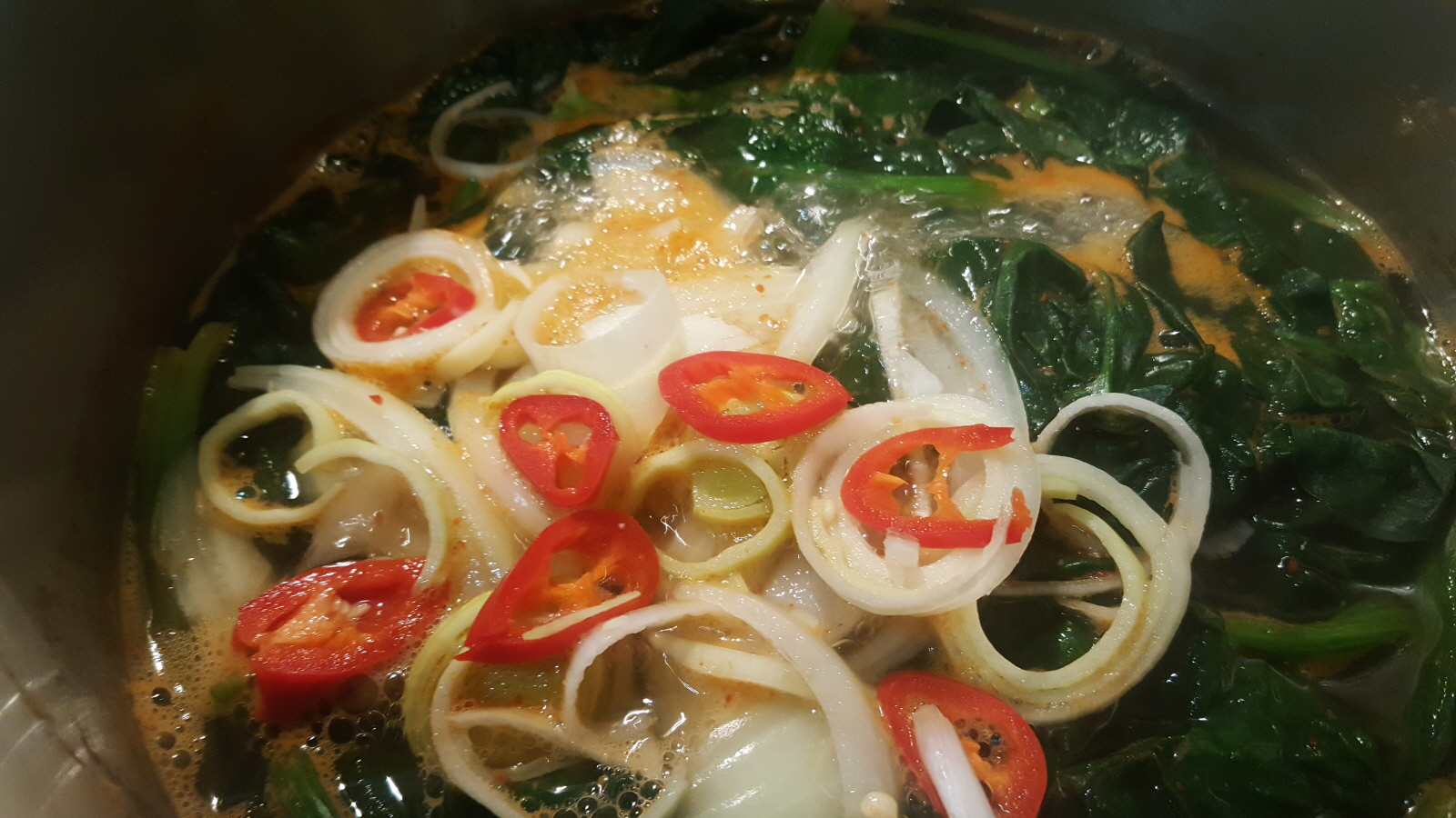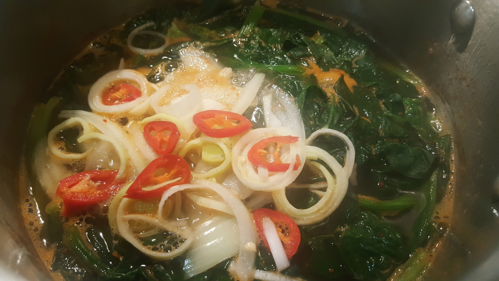 3. 시금치 넣고 중간 불로 끓이다가, 양파 넣고 다시 끓임.