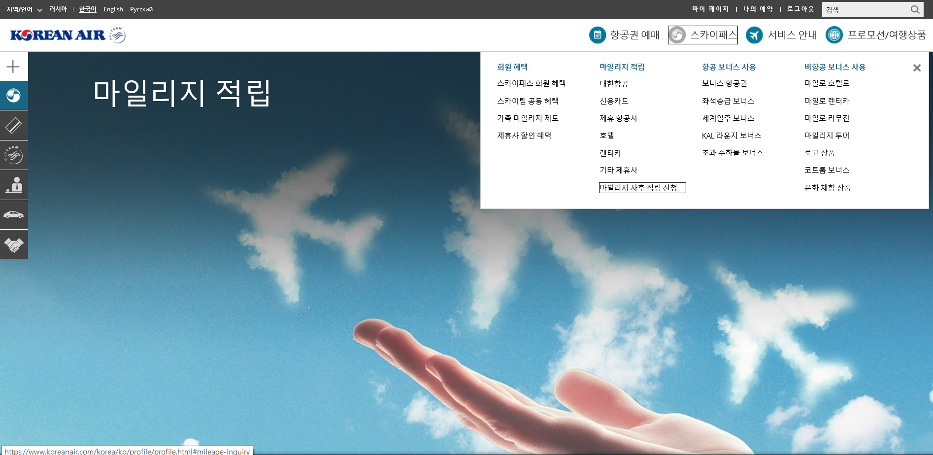 스카이패스 > 마일리지적립> 마일리지 사후 적립 신청