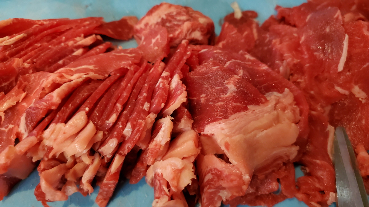 소고기 얼려서 열심히 썰었어요.