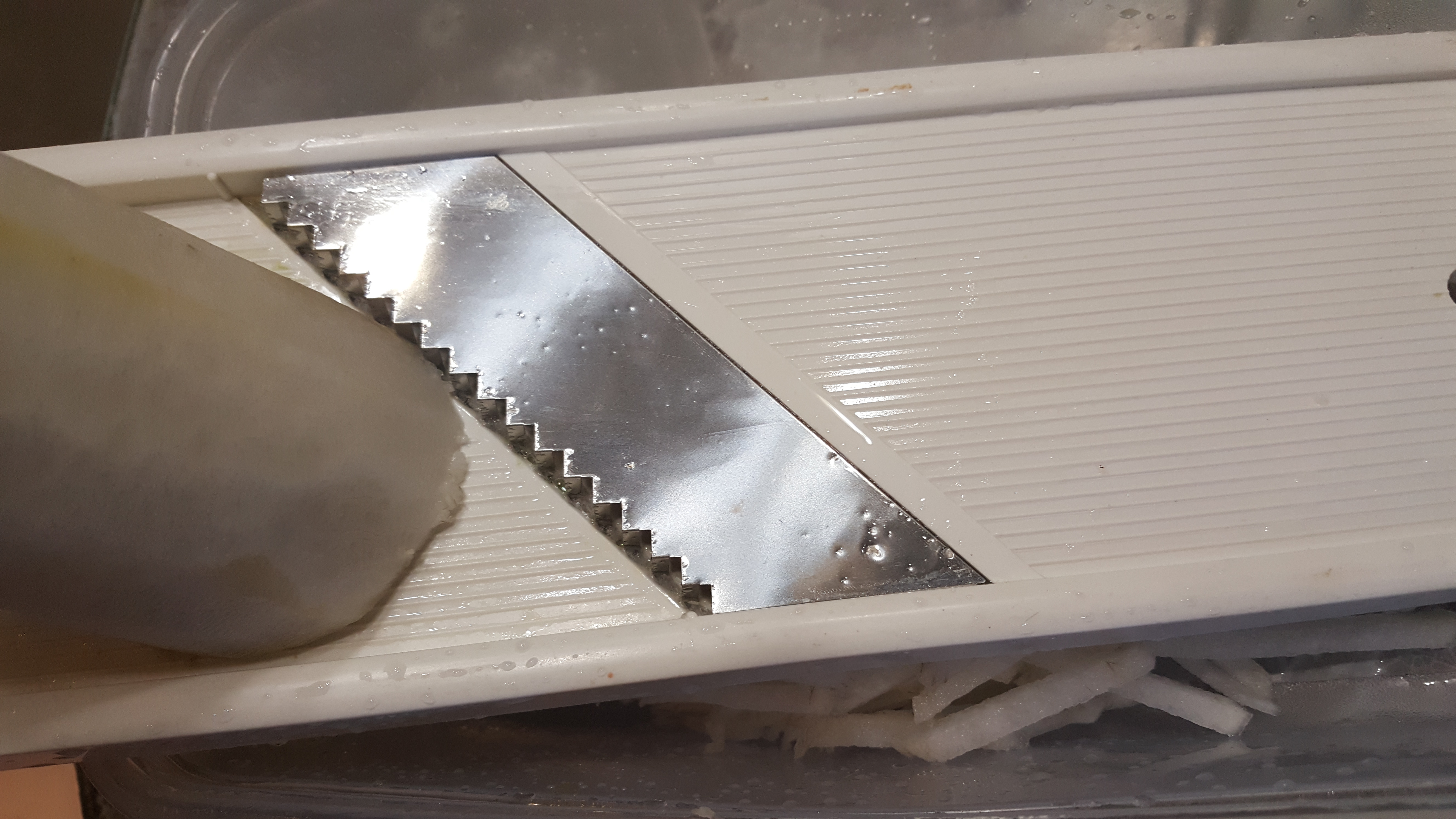 엄마가 항상 채칼 쓰기 전에 고무장갑 안에 면장갑 이중으로 끼라고 말해줬어요.