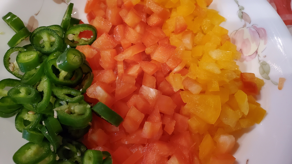 에 미리 준비해둔 고추와, 파프리카, 파를 섞어주면 완성!!