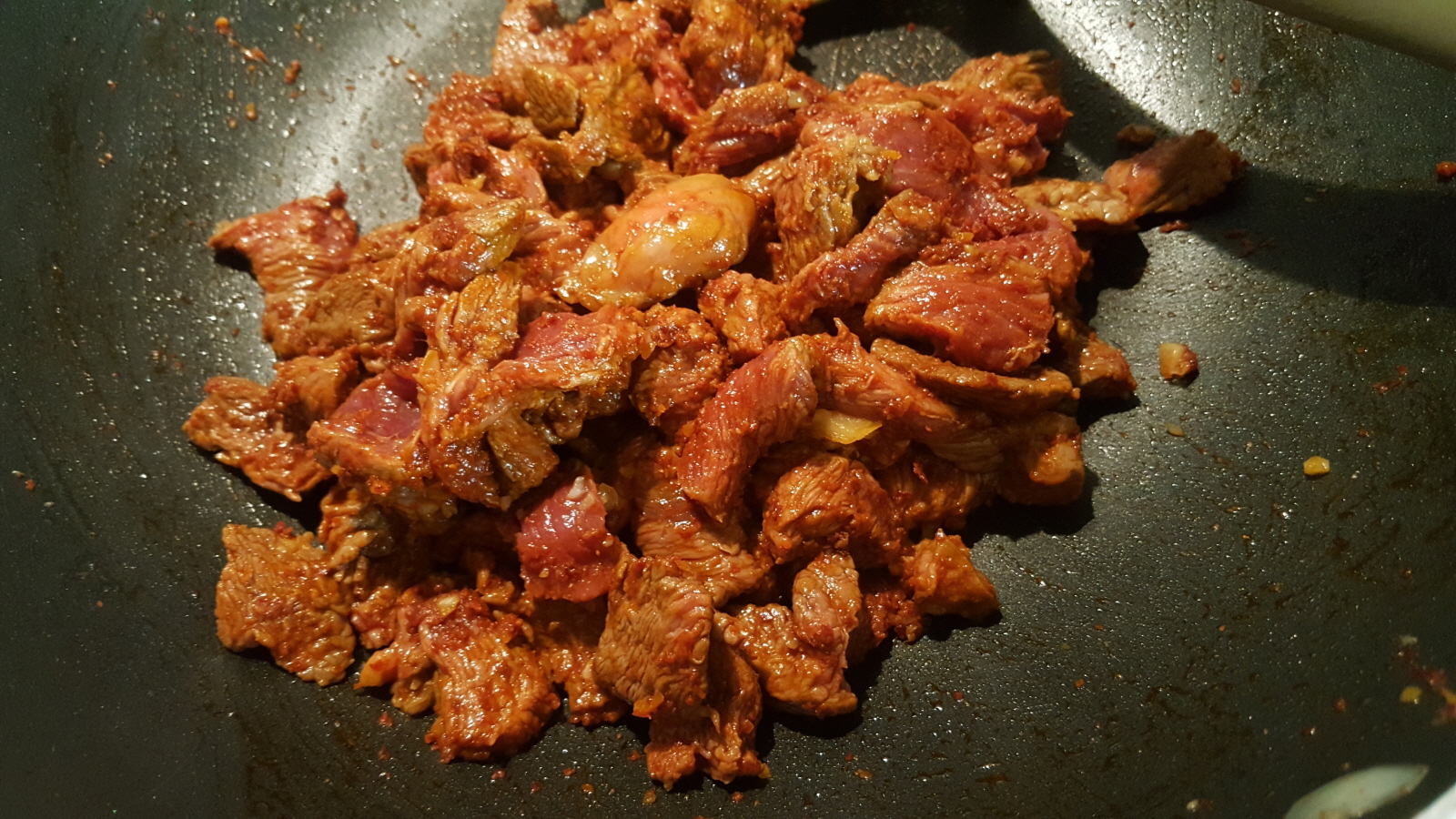 중약불, 참기름에 마늘 1스푼 + 고기 볶아주다가