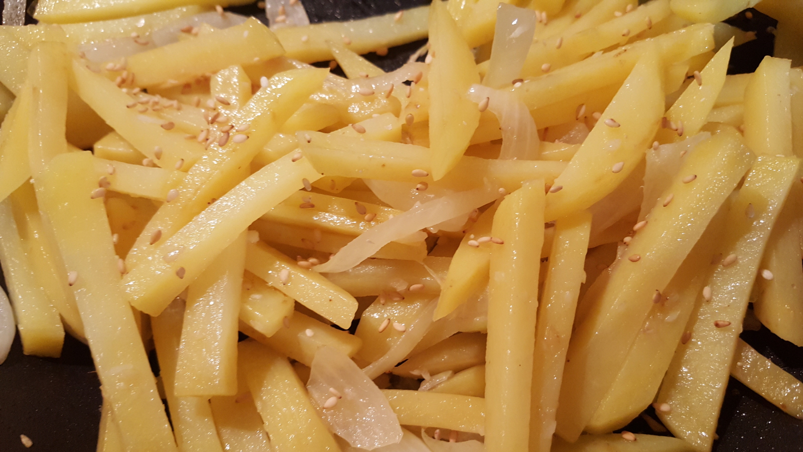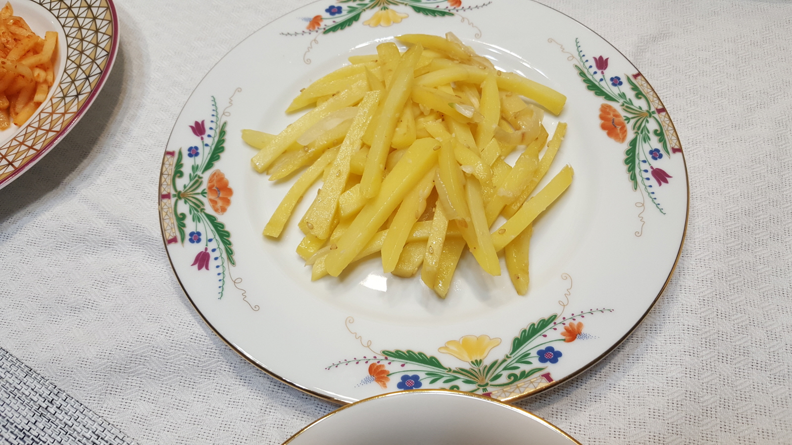 물기뺀 감자 볶다가 , 양파도 넣고 잘 익혀주면서