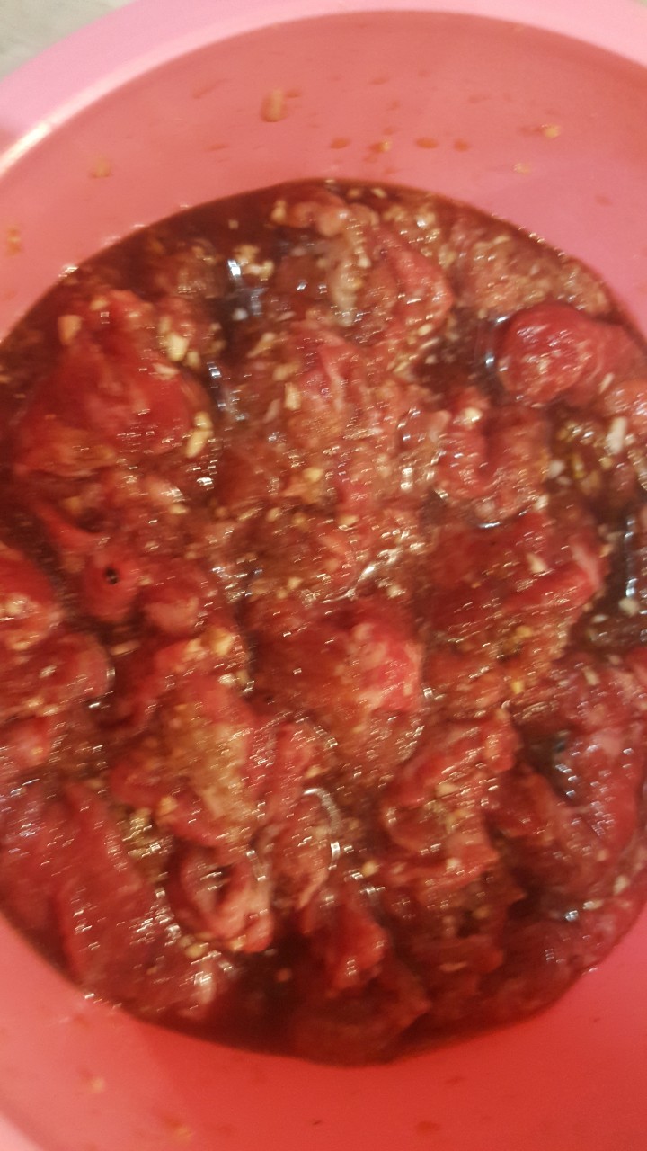 양념해놓고 기다립니다.(고기 500g, 간장 5, 설탕 2, 물엿 1, 마늘 2, 매실 1, 생강가루 조금, 액젓 1, 배가 없어서 (사과+양파즙))