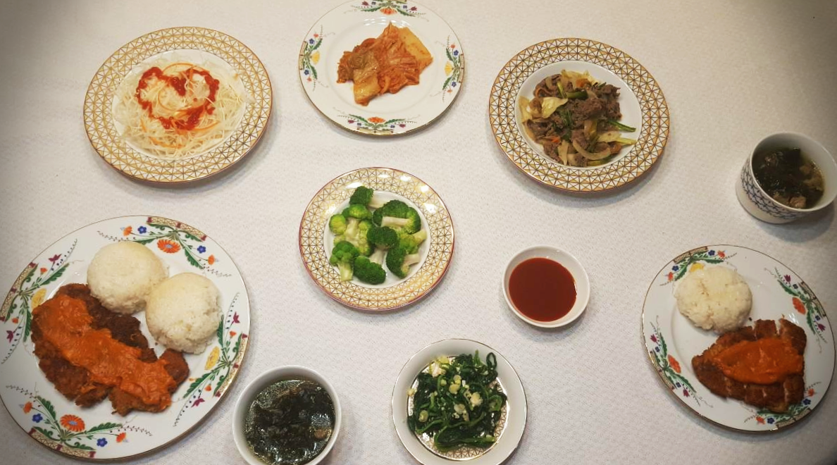 불고기, 돈가스, 미역국, 데친 브로콜리&초장, 시금치무침, 양배추 샐러드 김치전(시간 초과) 할 거예요!